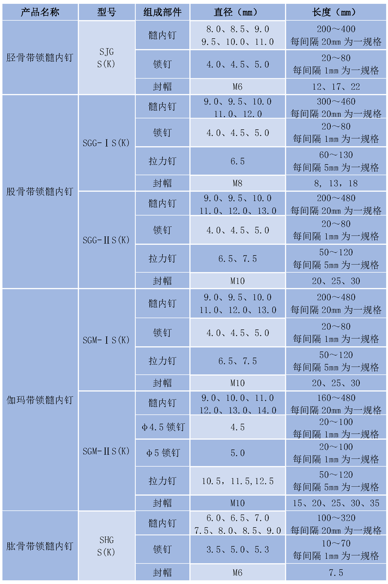 適用于股骨干骨折、股骨近端和干骺端骨折、脛骨干骨折、肱骨干骨折等內(nèi)固定。
